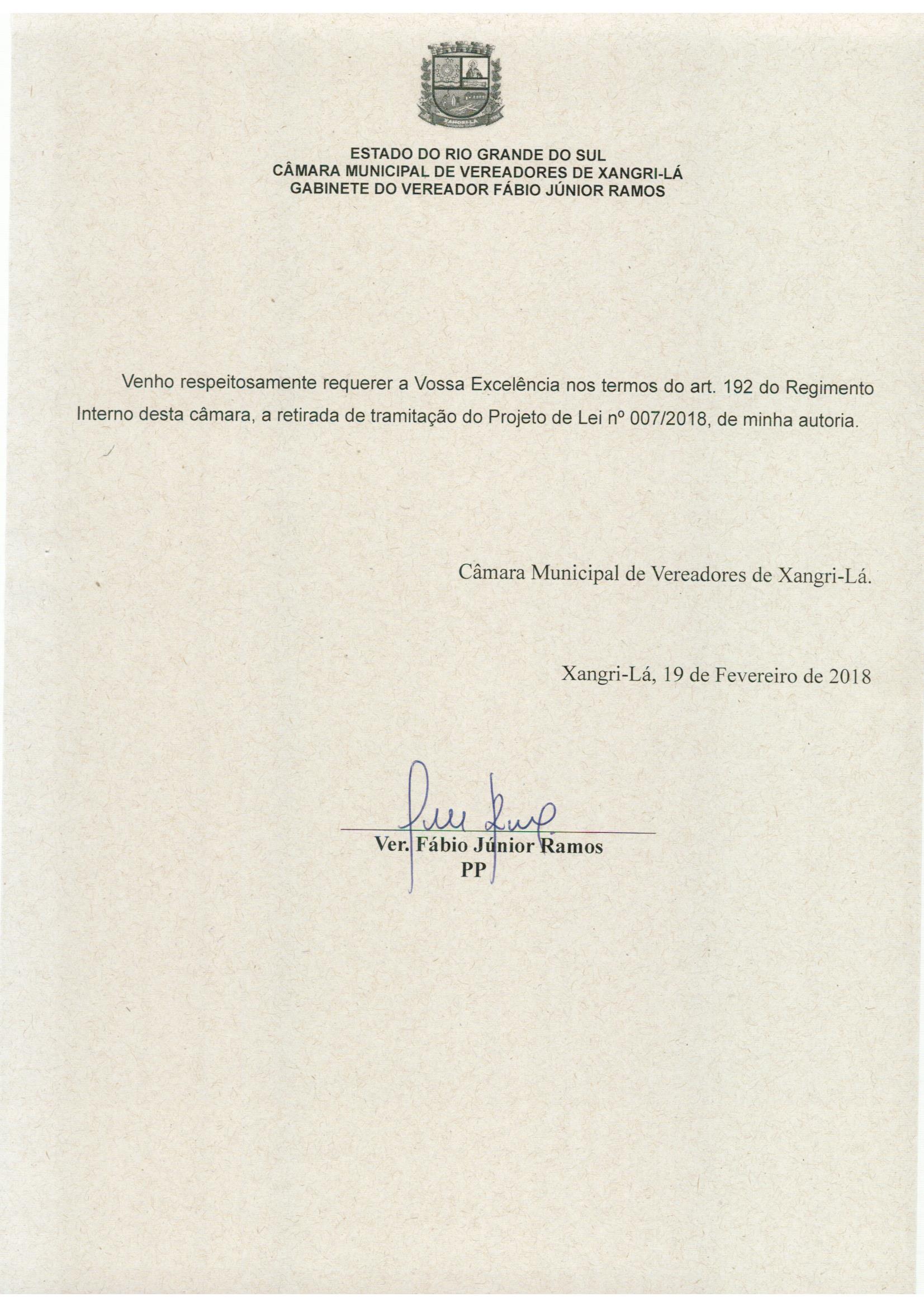 | Retirada de projeto de lei | Anexo | 19/02/2018 | Fábio Júnior Ramos | 581.jpeg |