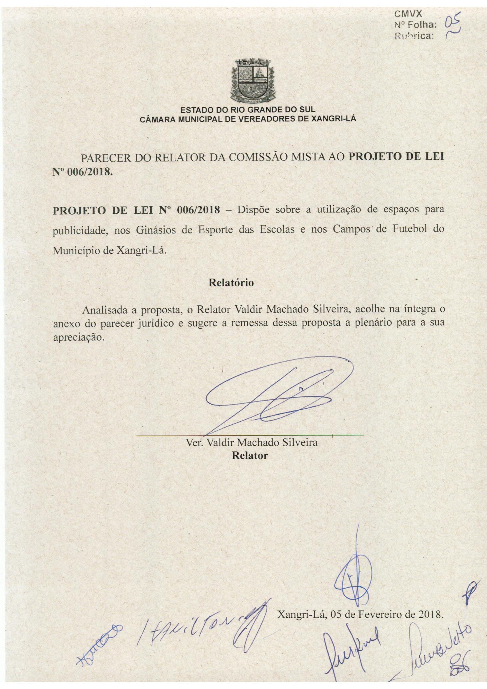 Parecer - Parecer do Relator CM de 05/02/2018 por Valdir Machado (Projeto de Lei nº 6 de 2018)