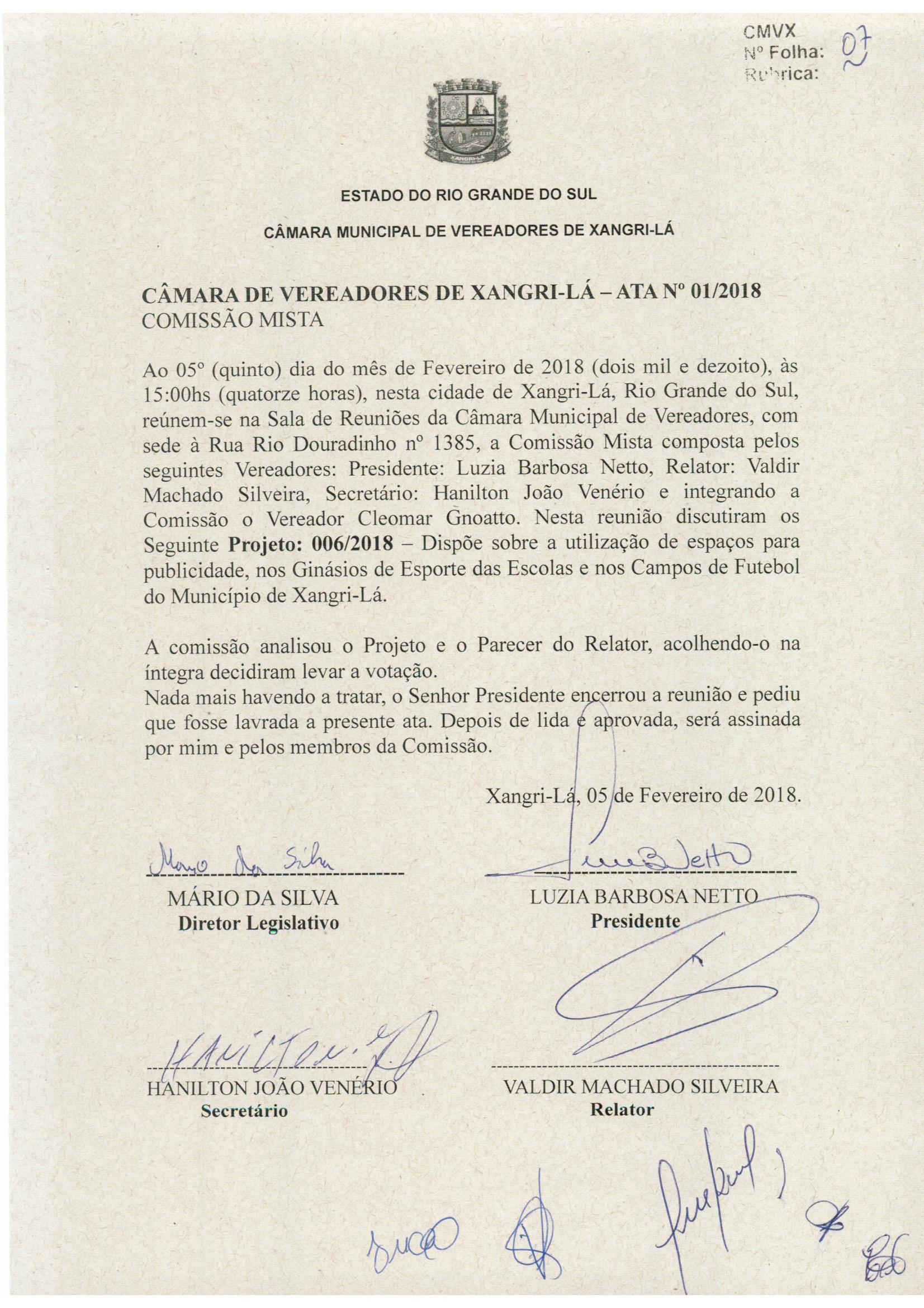 Ata de Reunião - Ata da CM de 05/02/2018 por Comissão Mista (Projeto de Lei nº 6 de 2018)